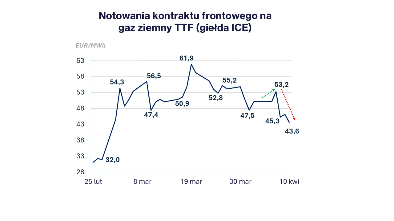 Według Andreasa Schroedera, analityka z agencji branżowej ICIS, bezpieczne wznowienie katarskiej produkcji LNG w ciągu dwóch tygodni nie byłoby możliwe. W środę pojawiła się informacja, że Katar przygotowuje się do wznowienia produkcji po ogłoszeniu zawieszenia broni między USA a Iranem, co spowodowało spadek cen gazu do około 45 EUR/MWh. Po deklaracji „podwójnego zawieszenia broni” poprawiły się warunki bezpieczeństwa, umożliwiając rozpoczęcie niezbędnych prac konserwacyjnych. Notowania gazu rosły ze środy na czwartek, gdy USA i Iran spierały się o zakres rozejmu — m.in. o to, czy wstrzymanie ataków na Liban było częścią porozumienia. Dodatkowo brak realnej możliwości tranzytu przez Cieśninę Ormuz wciąż wspierał ceny gazu.