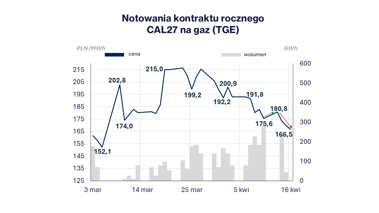 Notowania kontraktu rocznego CAL27 od piątku (10.04) ulegały sukcesywnemu obniżeniu z poziomu 175,60 PLN/MWh pod koniec tygodnia, do 166,50 PLN/MWh na wczorajszym zamknięciu sesji. Ceny gazu w Polsce podążały za impulsami z europejskiego rynku, liczącego na oznaki zakończenia wojny na Bliskim Wschodzie. Na początku tygodnia udział gazu w polskiej strukturze wytworzenia spadł do 11% z racji zwiększenia generacji z farm wiatrowych, jednak środa i czwartek przyniosły powrót do 14% udziału w miksie (znikoma produkcja z wiatru), pomimo wzrostu generacji z instalacji fotowoltaicznych.