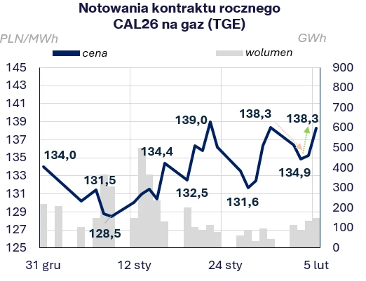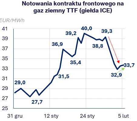 Od ubiegłego czwartku (29.01) notowania gazu w punkcie TTF (MAR26) najpierw wzrosły w piątek do 39,3 EUR/MWh, a następnie spadły o 14% podczas poniedziałkowej sesji do poziomu 33,9 EUR/MWh. We wtorek nastąpiło pogłębienie korekty do 32,9 EUR/MWh. Zakończenie poprzedniego tygodnia na wysokim poziomie, zapewniły obawy o rozwój sytuacji w Iranie oraz ponowny wzrost cen gazu w USA. Dodatkowo kompleks Golden Pass LNG, który miał rozpocząć eksport skroplonego gazu w styczniu, najprawdopodobniej pierwszą jednostkę wyśle nie szybciej niż w marcu. Warto zauważyć, że głównym nabywcą amerykańskiego LNG jest Europa, której magazyny zapełnione są w 39% wobec średniej 5-letniej dla tego okresu, oscylującej wokół 56%. Poniedziałkowa korekta do wynikała z kolei z: redukcji premii za ryzyko eskalacji Iran-USA, powrotu poboru gazu z sieci przez amerykańskie kompleksy LNG do poziomu sprzed fali mrozu (tj. +60% od początku ubiegłego tygodnia), a także decyzji inwestorów spekulacyjnych o realizacji zysków z 40% styczniowego rajdu cenowego w kontraktach na TTF. Dodatkowo we Francji przywrócono większą generację z elektrowni jądrowych, a na początku tygodnia odnotowano rekordową produkcję energii z farm wiatrowych – co łącznie z oczekiwanych ociepleniem w dalszej części tygodnia- doprowadziło do obserwowanej korekty na rynku. Późniejsze odbicie cen do 34 EUR/MWh podczas dzisiejszej sesji wynika z obaw o ochłodzenie po 13 lutego w Europie oraz niskie stany magazynowe w Niemczech przy oczekiwanym w przyszłym tygodniu spadku wytworzenia z tamtejszych farm wiatrowych.