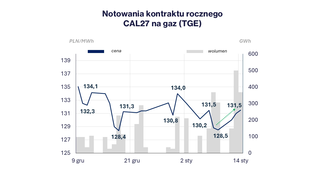 Notowania kontraktu rocznego na gaz ziemny CAL27 na TGE były bardziej stabilne od szybko rosnących cen spotowych oraz najbliższych miesięcy, ponieważ rynek uwzględnia przejściowy charakter obecnego (zimowego) napięcia w systemie energetycznym oraz oczekiwaną wysoką podaż LNG, odczuwalną już w tym roku. Notowania CAL27 najpierw osłabiły się do 128,5 PLN/MWh w zeszły piątek, a następnie sukcesywnie umacniały do 131,5 PLN/MWh na zamknięciu wczorajszej (14.01) sesji. Dla porównania- na przestrzeni obecnego tygodnia notowania kontraktu miesięcznego (luty 2026) wzrosły ze 149 PLN/MWh w poniedziałek do 163,75 PLN/MWh na koniec dzisiejszej sesji giełdowej. Dane Eurelectric wskazują, że udział gazu ziemnego w krajowej strukturze wytworzenia energii elektrycznej wahał się od 18% (w dniach 7-8 stycznia-mroźny koniec tygodnia i niska generacja z wiatru ok.4%-5% miksu) do 15-16% od niedzieli, kiedy najpierw chwilowo wzrósł udział generacji z farm wiatrowych, a w kolejnych trzech dniach produkcja energii z bloków węglowych.