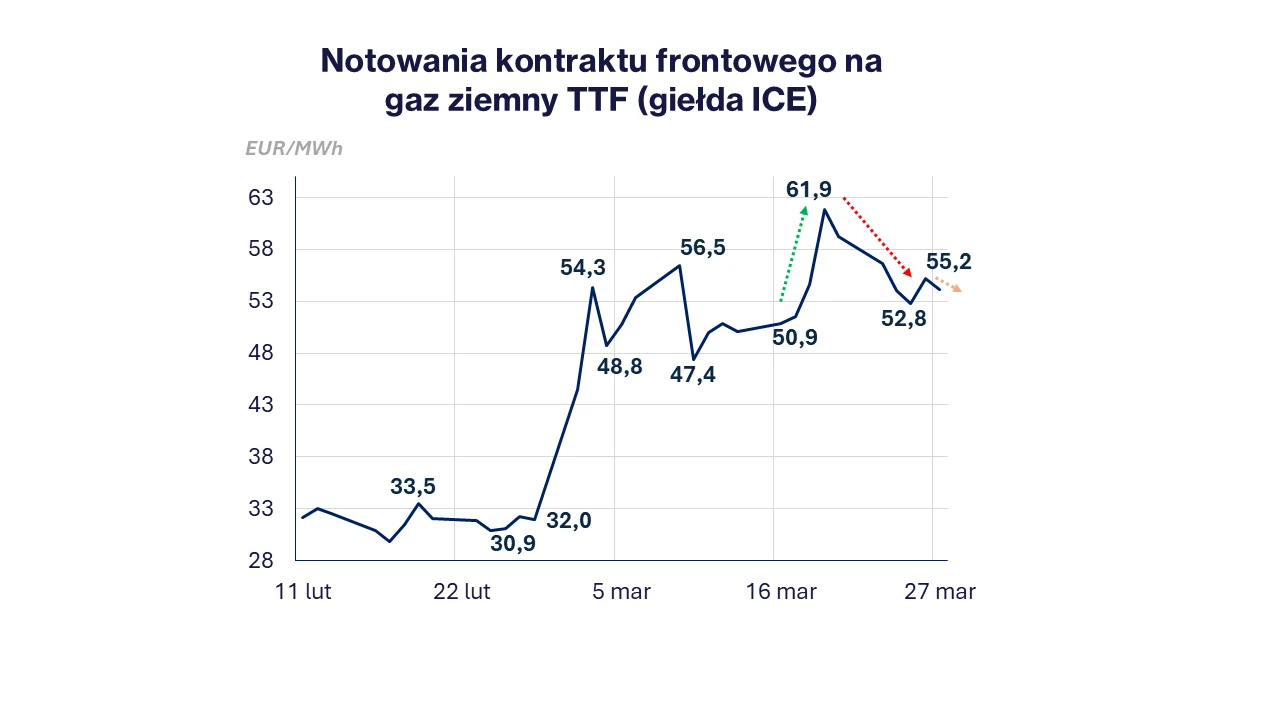 Piątkową (20.03) sesję zakończyliśmy około 4% spadkiem notowań gazu (TTF APR26) do poziomu 59,26 EUR/MWh. Wśród czynników przemawiających za spadkiem cen można było wskazać informację, że skala szkód infrastruktury w Ras Laffan po atakach Iranu okazała się mniejsza, względem obaw rynku. Czynnikiem umacniającym ceny na początku tygodnia (do poziomu 62 EUR/MWh) było zaostrzenie się konfliktu na Bliskim Wschodzie, spowodowane ultimatum prezydenta Donalda Trumpa. Podobnie jak w przypadku ropy naftowej, późniejsze informacje o wstrzymaniu ataków USA na Iran przez 5 dni i przekazaniu 15-punktowej propozycji zawarcia pokoju, poskutkowały gwałtownym spadkiem cen z 62 EUR/MWh do 56 EUR/MWh – w zaledwie 15 minut. Później notowania kontraktu frontowego osłabiły się do 54 EUR/MWh. W kolejnych dniach ceny gazu kontynuowały trend spadkowy – uczestnicy rynku liczyli, że informację o możliwych negocjacjach pokojowych zwiastują deeskalacje konfliktu a najbliższym czasie. Dopiero w czwartek (26.03) ceny umocniły się, po rzekomym odrzuceniu przez Iran planu porozumienia. Oczekiwane są też niższe niż wcześniej oczekiwano prognozy temperatury na początku kwietnia w Europie.