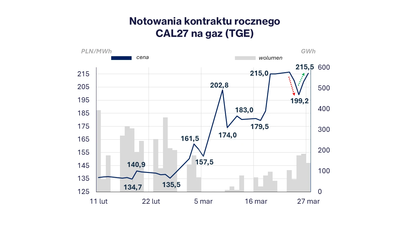 Notowania kontraktu CAL27 na polskiej Towarowej Giełdzie Energii na przestrzeni zakończył luty na poziomie 139 PLN/MWh, a w pierwszej dekadzie marca wzrosło 46% w okolice 203 PLN/MWh. W tym okresie ceny podążały za notowaniami w punkcie TTF, napędzanymi obawami o skutki ogłoszenia siły wyższej w katarskich kompleksach LNG. Najwyższy poziom ceny rozliczeniowej CAL27 osiągnął w tym miesiącu po informacjach o atakach na South Pars i odwecie na katarskim Ras Laffan, a także 48‑godzinnym ultimatum D. Trumpa wobec Iranu, celem zmuszenia Teheranu do otwarcia Cieśniny Ormuz (216,5 PLN/MWh – 23.03). Warto dodać, że udział katarskiego LNG w polskim imporcie wynosił 20% w ubiegłym roku, zaś w zeszłym tygodniu do portu w Świnoujściu dotarł (najprawdopodobniej ostatni w dłuższym czasie) gazowiec z LNG z Kataru, który wypłynął z portu w połowie lutego. W obecnym miesiącu zapełnienie krajowych magazynów gazu wynosiło 46% wobec 44% w zeszłym roku, co jest dobrym wynikiem na tle UE. Udział gazu w polskiej strukturze wytworzenia spadł do 15% w obecnym miesiącu wobec 19% w lutym, za sprawą podwojenia generacji z instalacji PV. W ubiegłym tygodniu notowania kontraktu rocznego oscylowały w przedziale 200–210 PLN/MWh.