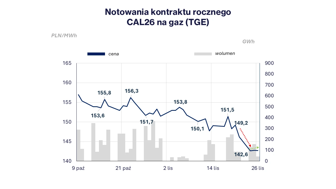 Pod koniec zeszłego tygodnia notowania kontraktu CAL26 na polskiej TGE kierowały się tendencją spadkową dochodząc do najniższego poziomu w poniedziałek wynoszącego 142,64 PLN/MWh. Następnie ceny wzrosły do 142,73 PLN/MWh wczoraj.