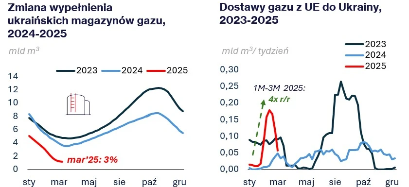 Drugi ważny aspekt to niski poziom zapełnienia unijnych magazynów gazu (34,3% tj. o 46% niższy poziom od 5-letniej średniej) i krytycznie niski poziom zapełnienia magazynów ukraińskich (3,56%). W związku z tym, trwają negocjacje państw UE o zmianie celu wypełnienia magazynów gazu. Komisja Europejska ogłosiła utrzymanie obecnych celów do 2027 roku, ale musi to zostać zatwierdzone przez państwa UE oraz Parlament Europejski. Niemcy, Francja i Holandia wskazują, że obowiązujące terminy zapełnienia magazynów nie tylko powodują wzrost cen, ale tworzą okazję do manipulacji cenowej (inni uczestnicy rynku wiedzą, że kraje wspólnoty będą zmuszone kupić gaz przed konkretną datą). Dlatego według nieoficjalnej propozycji negocjowany jest wariant: 90% zapełnienia magazynów w okresie od 1 października do 1 grudnia.