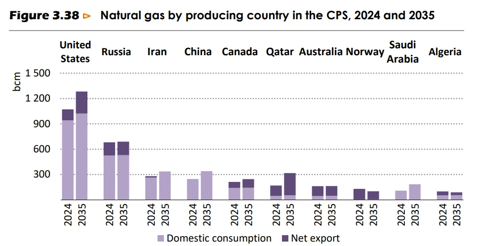 Rosja | Produkcja gazu ziemnego w Rosji pozostaje na stabilnym poziomie około 680 mld m³ do 2035 r., podobnie jak eksport, wynoszący około 160 mld m³ (Wykres 3). Zakłada się, że ceny krajowe rosną, aby zrekompensować spadające przychody z eksportu. Złoża gazu w Zachodniej Syberii zyskują nowe życie od połowy lat 30., gdy gazociąg Siła Syberii II do Chin zwiększa przepustowość. | Produkcja gazu ziemnego w Rosji spada z 680 mld m³ w 2024 r. do 670 mld m³ w 2035 r., a eksport netto zmniejsza się o 10% w tym samym okresie (Wykres 4). Spadające zyski ograniczają inwestycje upstream, a produkcja zmniejsza się na dojrzałych złożach (takich jak Urengoy i Yamburg).