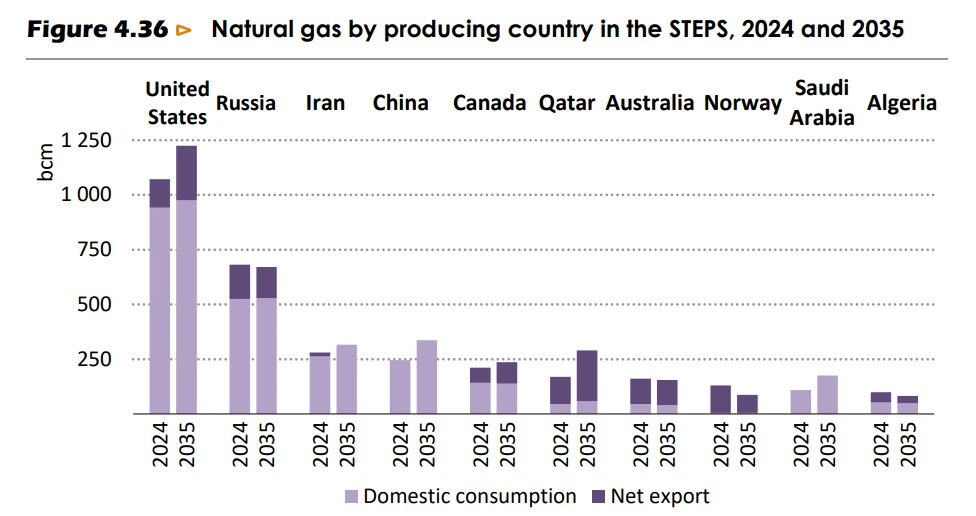 Katar zwiększa produkcję ze 170 mld m³ w 2024 r. do ponad 300 mld m³ w 2035 r., przy czym większość tego dodatkowego wolumenu jest przeznaczona na zwiększenie eksportu LNG. Arabia Saudyjska zwiększa produkcję gazu niezwiązanego z ropą fantową (non-associated gas), podnosząc wydobycie o ponad 75 mld m³ między 2024 a 2035 r., aby sprostać rosnącemu zapotrzebowaniu na energię elektryczną oraz zastąpić ropę w krajowym systemie energetycznym (złoże Jafurah ma dostarczać niemal 15% całkowitej saudyjskiej produkcji gazu w przeciągu 5 lat). | W scenariuszu STEPS wzrost podaży gazu ziemnego w latach do 2035 r. jest napędzany głównie przez Bliski Wschód i Stany Zjednoczone, których łączna produkcja zwiększa się o blisko 450 mld m³ (Wykres 4). Bliski Wschód notuje największy wzrost podaży do 2035 r., na czele z Katarem, Arabią Saudyjską i Zjednoczonymi Emiratami Arabskimi. Produkcja gazu ziemnego w Katarze rośnie o 70% między 2024 a 2035 r., przy czym niemal cały wzrost o 120 mld m³ przeznaczony jest na eksport.