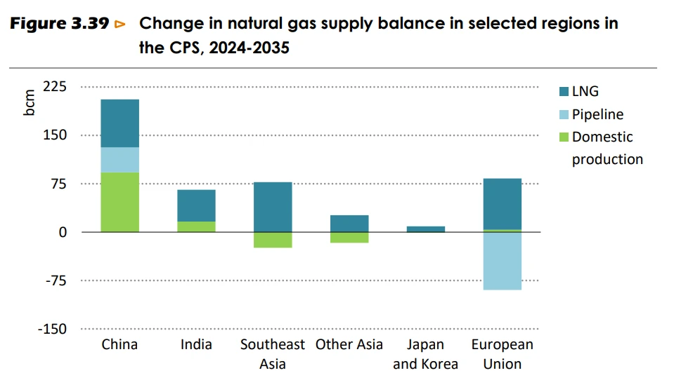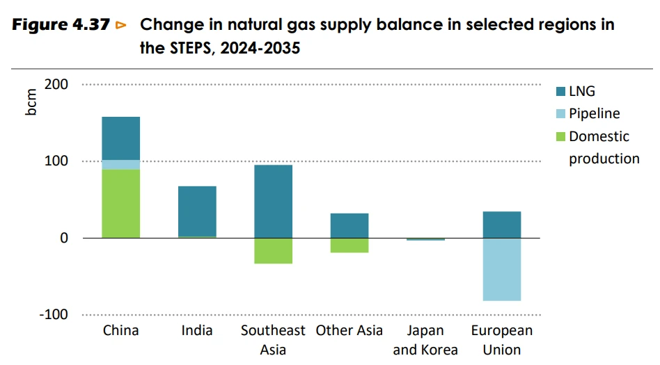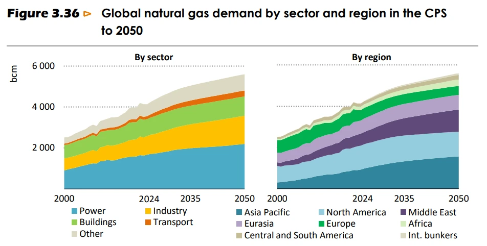 Gospodarki wschodzące i rozwijające się | Popyt w gospodarkach wschodzących i rozwijających się w Azji wzrasta o 340 mld m³ między 2024 a 2035 rokiem. Około 35% tego wzrostu przypada na sektor energetyczny, a kolejne 35% na przemysł. Region dodaje 270 GW nowej mocy w elektrowniach gazowych, co oznacza wzrost o 70% w porównaniu z obecnym poziomem.
