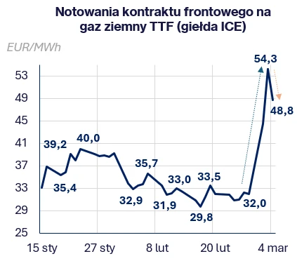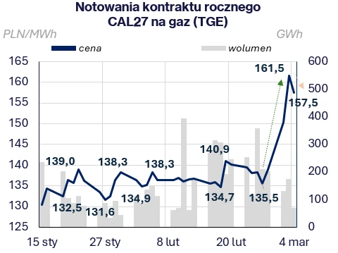 Jeśli chodzi o sytuację związaną z wojną na Bliskim Wschodzie, notowania w Polsce podążają za paniką na rynkach Europy Północno-Zachodniej. Jednocześnie Gaz-System uspokaja w komunikatach, że bezpieczeństwo dostaw zapewniają możliwość importu z Norwegii przez Baltic Pipe, fizyczny rewers z Niemiec oraz rosnąca podaż LNG z USA.